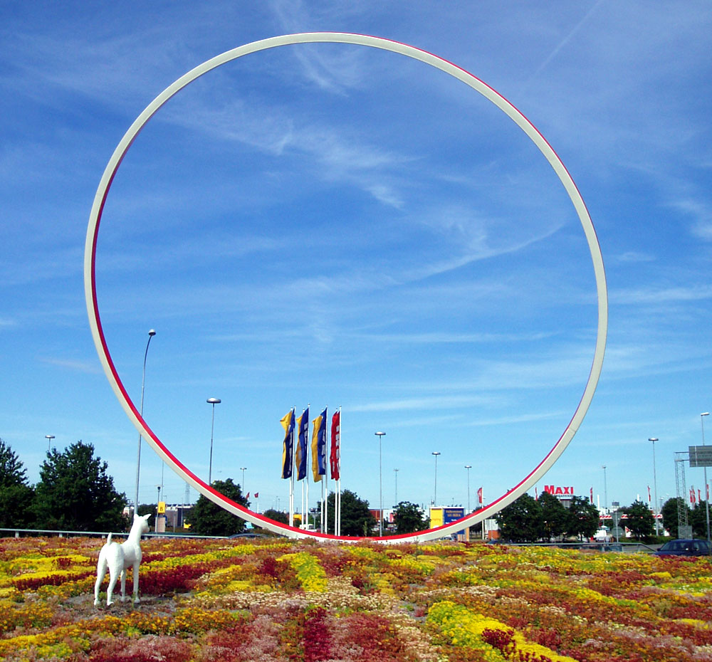 In the course of time, rondeller, or circulation places as they are officially called, became so popular that a fashion developed for decorating them. This first occurred (legally) in Linköping, which once again found itself in the roundabout vanguard. Or avant garde, I suppose. This first took the form of a commissioned ‘sculpture’ of a concrete ring, of the same circumference of the roundabout, but placed on its side and enigmatically named Cirkulationsplats II. When this was vandalised, a smaller figure of a concrete dog took its place. Nothing daunted, these serial vandals decapitated it. Never fear. The council once again rose to the challenge and this time put a metal version in its place.